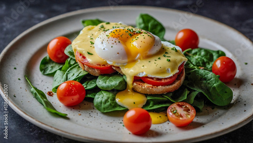 Delicious eggs benedict served on a bed of fresh spinach with cherry tomatoes garnishing