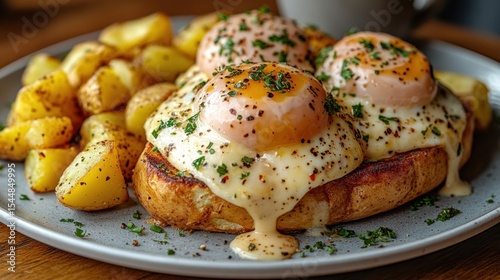 Delicious Eggs Benedict with Roasted Potatoes Closeup View
