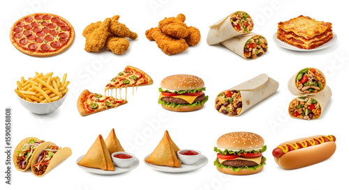 Delicious fast food variety perfect for menus and promotions including pizza, burgers, tacos, burritos, and fried chicken appealing to hungry customers with tasty meals
