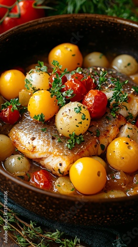 Delicious fish dish with colorful vegetables and herbs, served in a rustic bowl.