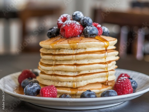 Delicious Fluffy Pancakes Topped with Fresh Berries and Maple Syrup