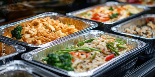 Delicious food in reusable containers showcases variety of colorful dishes, including stir fried vegetables and chicken. Perfect for festive gatherings and meal prep!