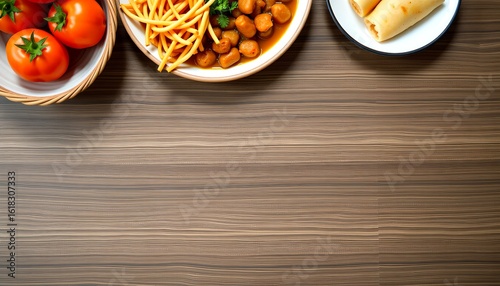 delicious food placed on wooden table. The food is fresh, natural and ready to eat. Perfect image for restaurant, food shop and food magazines
