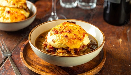 Delicious French Onion Soup with Golden Cheese Crust on Wooden Plate.