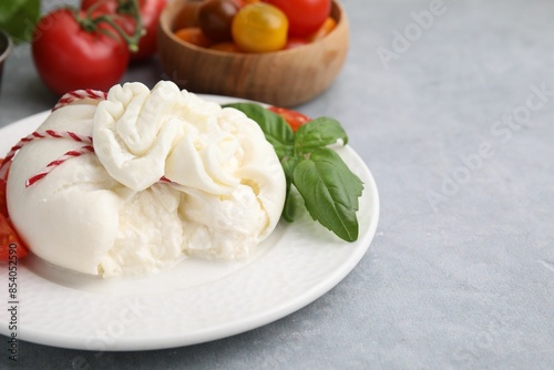 Delicious fresh burrata cheese with basil leaves on grey table, space for text