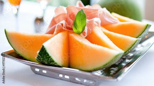 Delicious Fresh Cantaloupe Slices on Plate with Leaf Garnish
