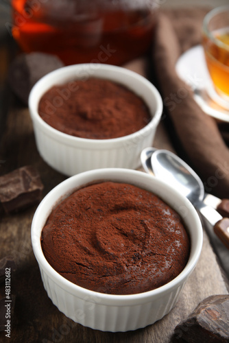 Delicious fresh chocolate fondant on wooden board
