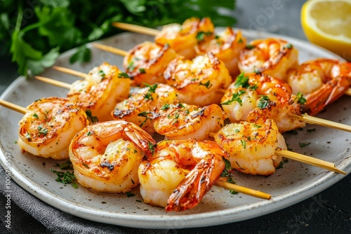 delicious fresh cooked skewered prawns prepared and presented ready to eat