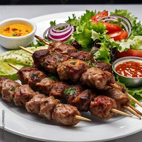 Delicious fresh Kebab assortment Served with some salad, grilled chicken skewers with a side of grilled vegetables, grilled kebab with couscous and vegetables