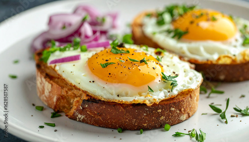Delicious fried eggs on toast with onions and herbs. Tasty food for breakfast.