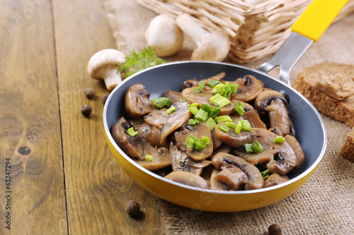 Delicious fried mushrooms in pan on table close-up