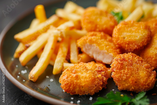 Delicious fried nuggets and french fries served on a table