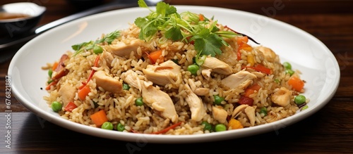 Delicious Fried rice with chicken served on white plate. AI generated image