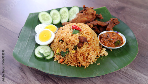Delicious fried rice with tender fried chicken, hard-boiled eggs, crisp cucumber slices, and a fiery chili paste served on a banana leaf.