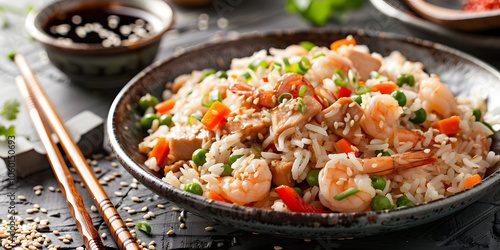 Delicious fried rice with vegetables, chicken, shrimp, and garnishes on ceramic plate