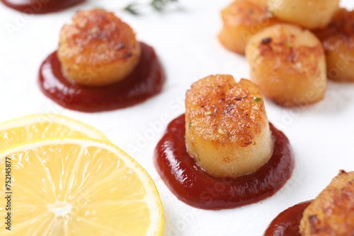 Delicious fried scallops with tomato sauce and lemon on plate, closeup