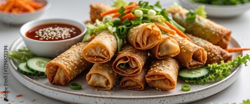 Delicious fried spring rolls served with fresh vegetables and sauce.