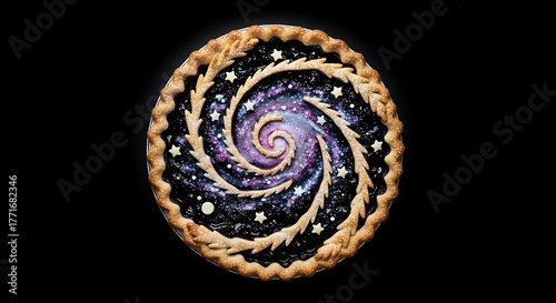 Delicious galaxy pie with a spiral nebula design on a black background perfect for space themed events