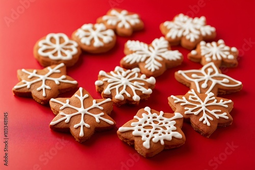 Delicious gingerbread cookies decorated with white sugar icing lying on vivid red background