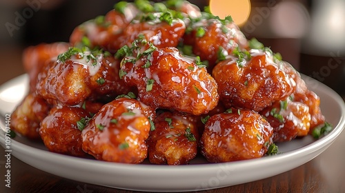 Delicious glazed chicken bites garnished with fresh herbs on a plate