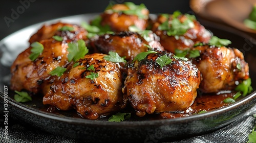 Delicious Glazed Chicken Thighs close up shot on dark plate garnished with fresh parsley Perfect for recipe blogs or food websites