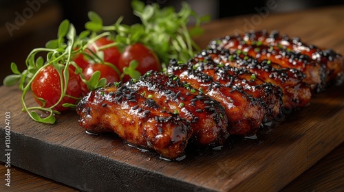 Delicious glazed chicken wings served on wooden board.
