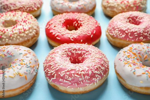 Delicious glazed doughnuts with sprinkles on color background