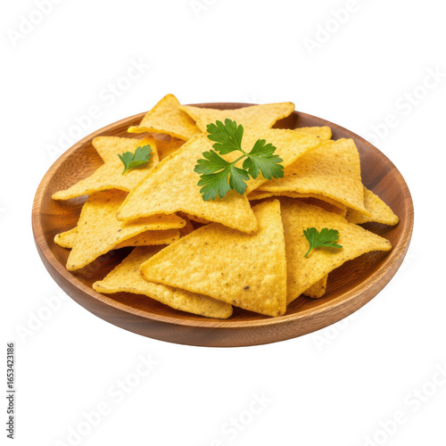 Delicious golden corn tortilla chips seasoned with herbs and garnished with fresh cilantro in a rustic wooden bowl isolated on transparent background
