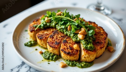 Delicious golden crispy breaded chicken cutlets topped with fresh green herbs and drizzled with vibrant green herb sauce on a white plate