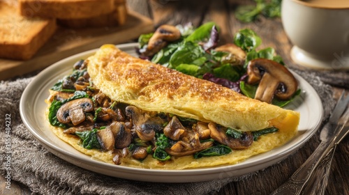 Delicious golden fried fish fillet served with saut?ed mushrooms and fresh greens on a rustic plate for a healthy seafood meal presentation