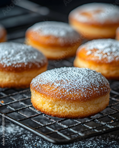 Delicious golden-brown mini cakes, freshly baked and dusted with powdered sugar, cooling on a wire rack. A close-up shot emphasizes their texture and sweetness.