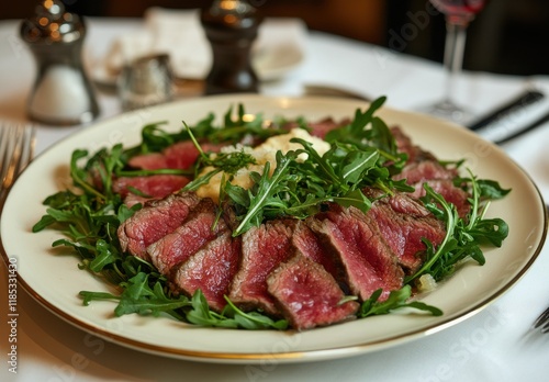 Delicious Gourmet Beef Carpaccio Served on a Platter with Fresh Arugula and Topped with Creamy Sauce in an Elegant Restaurant Setting