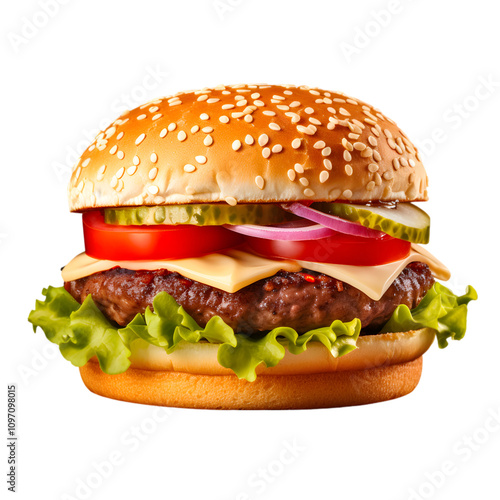 Delicious gourmet cheeseburger against a white background