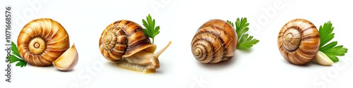 Delicious gourmet escargot with fresh parsley and garlic on white background ideal for culinary projects.