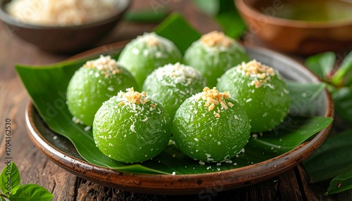 Delicious Green Mochi Balls on Banana Leaf Plate.
