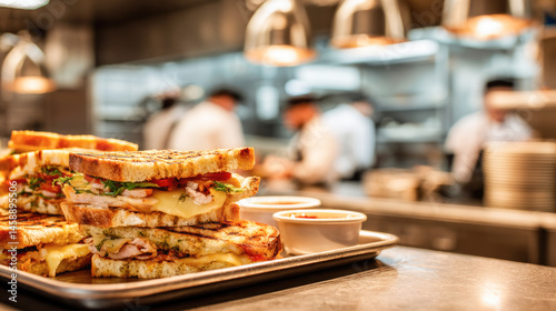 Delicious grilled cheese sandwich stack in bustling restaurant kitchen