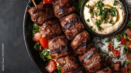 Delicious grilled meat skewers served over a bed of greens and rice, accompanied by a side of hummus, representing a perfect summer meal or picnic delight.