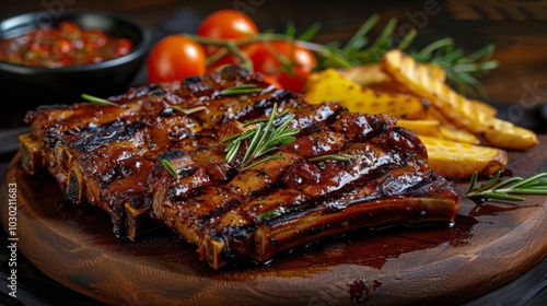 Delicious grilled pork chops garnished with fresh herbs served on a rustic wooden board