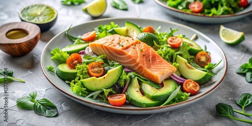 Delicious Grilled Salmon Salad with Fresh Avocado, Cherry Tomatoes, and Mixed Greens