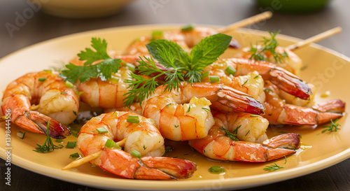 Delicious Grilled Shrimp Skewers With Citrus Glaze Garnished With Herbs