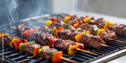 Delicious Grilled Skewers Barbecue Meat and Vegetable Kebabs Smoking on Grill