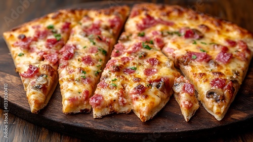 Delicious ham and mushroom pizza slices on wooden board.