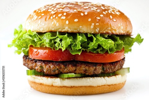 Delicious hamburger close up featuring fresh lettuce tomato beef and sesame bun on light background