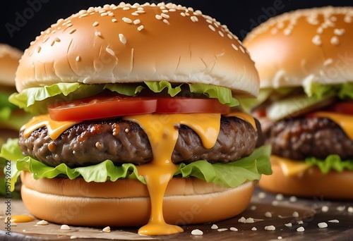 Delicious hamburger on a wooden table with a dark brown background behind. Fast food concept.