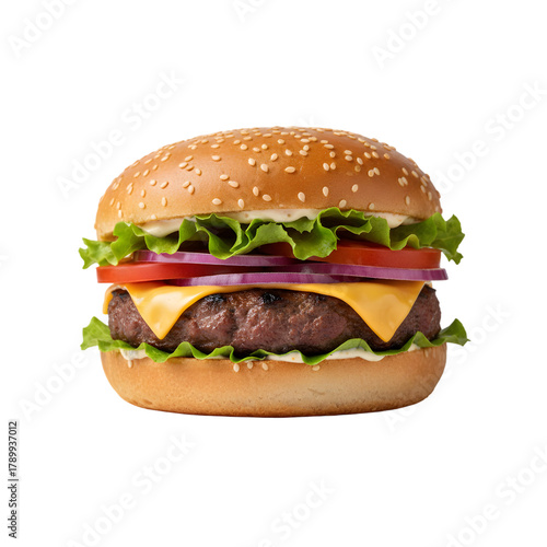 Delicious Hamburger with Cheese Lettuce Tomato and Onion on a Sesame Seed Bun Isolated on Black Background
