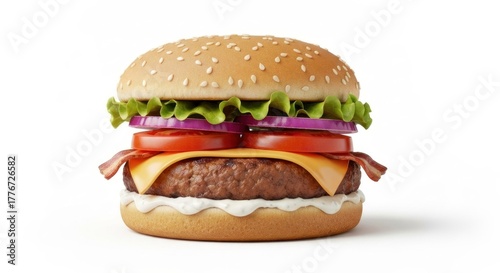 Delicious hamburger with patty, cheese, lettuce, tomatoes, onion, bacon on white