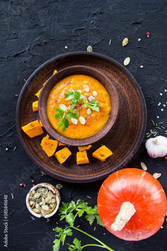 Delicious healthy pumpkin soup, herbs, and ingredients for the dish. Creative atmospheric decoration