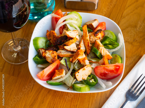 Delicious healthy salad with grilled chicken fillet, cucumber, green padron pepper, tomatoes and onion..