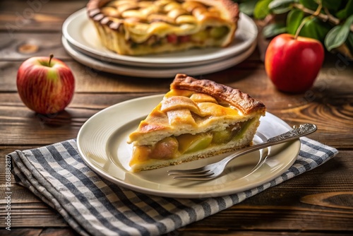 Delicious Homemade Apple Pie Slice on Plate with Linen Napkin - Stock Photo