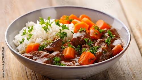 Delicious homemade beef stew with rice and carrots, served in a rustic bowl with parsley garnish. Perfect comfort food showcasing hearty flavors, natural ingredients, and warmth.